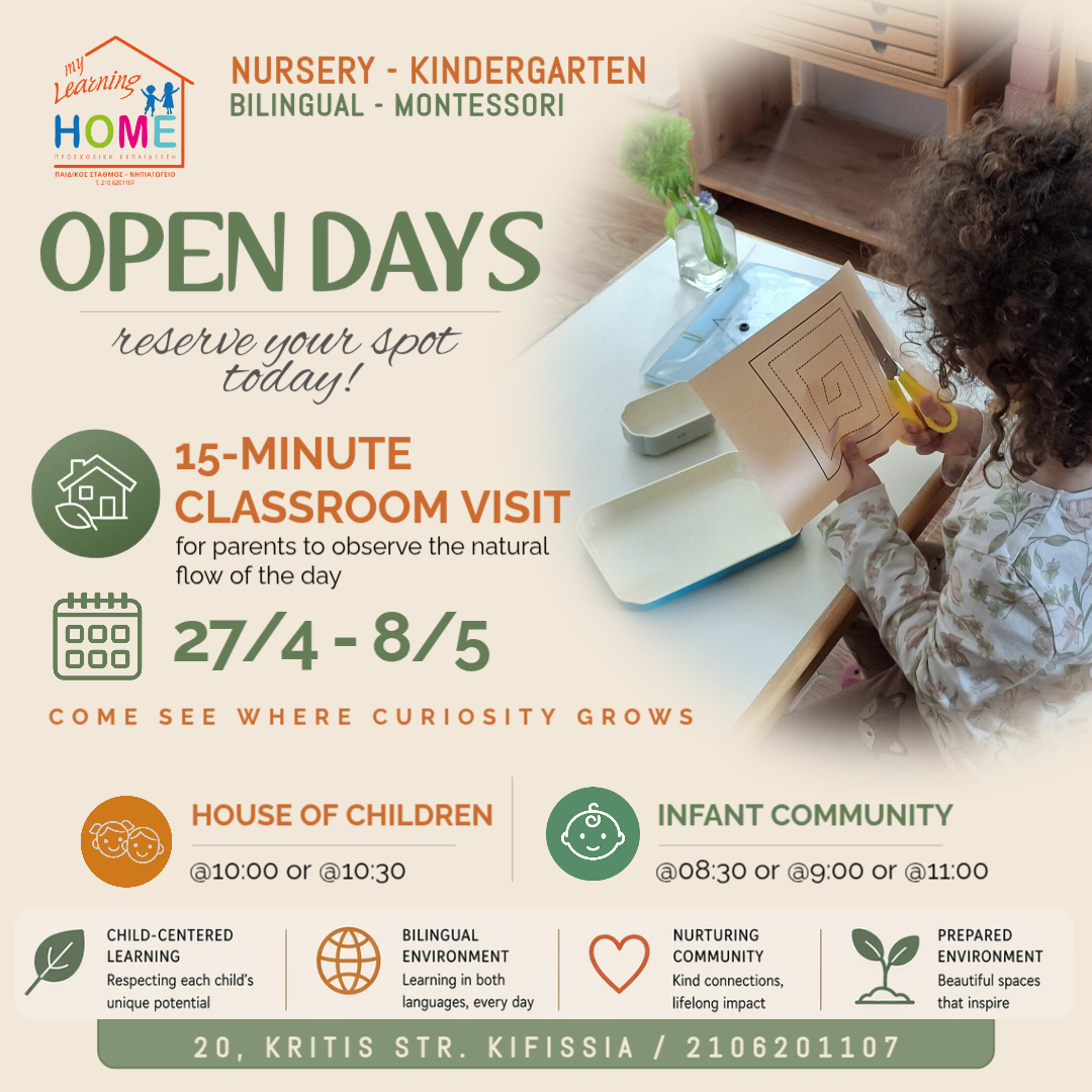 My Learning Home is located in an extraordinary Kifissia-styled villa and is surrounded by an enchanting garden. Our environment is properly prepared, equipped with rich Montessori material and with a well-trained staff.
